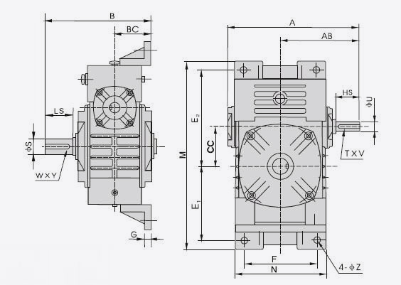 | 型號SIZE | 減速比Ratio | A | AB | B | BC | CC | N | M | F | E1 | E2 | G | Z | 入力軸input thaft | 出力軸 output thaft