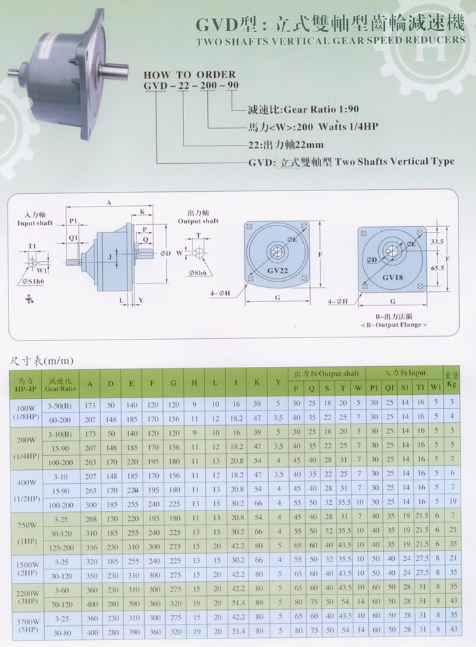 GVD立式齒輪減速電機(jī)的型號(hào)表示方式,GVD立式小齒輪減速機(jī)馬達(dá)的外形尺寸表,GVD18,GVD22,GVD28,GVD32,GVD40,GVD50;75W(1/10HP),100W(1/8HP),200W(1/4HP),400W(1/2HP),750W(1HP),1500W(2HP),2200W(3HP),3700W(5HP)