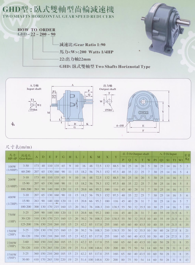 GHD臥式齒輪減速電機(jī)的型號表示方式,GHD臥式小齒輪減速機(jī)馬達(dá)的外形尺寸表,GHD18,GHD22,GHD28,GHD32,GHD40,GHD50;75W(1/10HP),100W(1/8HP),200W(1/4HP),400W(1/2HP),750W(1HP),1500W(2HP),2200W(3HP),3700W(5HP)
